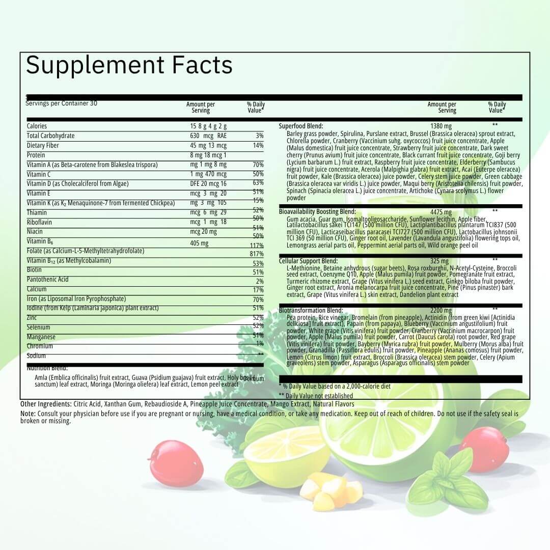 - Biotransformation Blend: Enhances nutrient availability through fermented botanicals like pea protein, rice vinegar, and enzymes from pineapple and papaya.