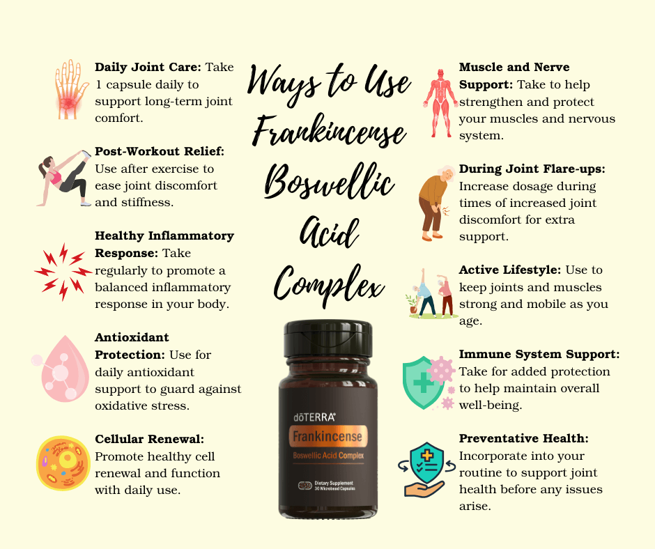 doTERRA Frankincense Capsules offer a compelling natural option for those seeking to support their body's natural inflammatory response, joint comfort, gut health, and cellular well-being, leveraging the scientifically supported properties of boswellic acids and frankincense essential oil.