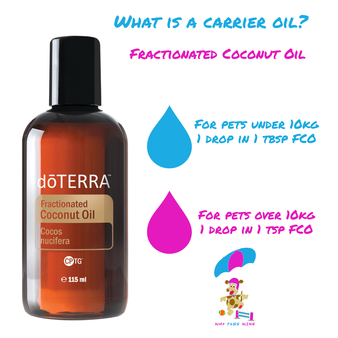 Fractionated coconut oil - this is ideal for diluting the oils as it is non greasy and won’t harm your dogs if they lick the area it is applied. this carrier oil will easily absorb into the skin which is ideal for topical application, it also provides a soothing barrier and is great for troubled skin. It is not greasy, has no odour and won’t stain either!