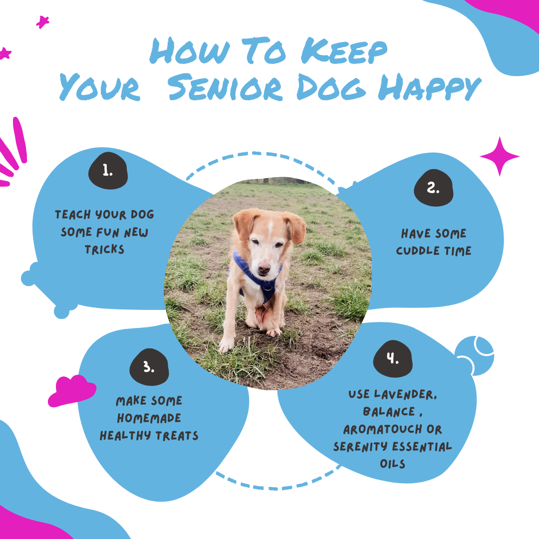 Maintaining a regular routine can reduce anxiety, as older pets often have anxiety related conditions and the same essential oils mentioned above can work wonderfully well either in a diffuser or applied topically and applied in a little massage can be even more beneficial.