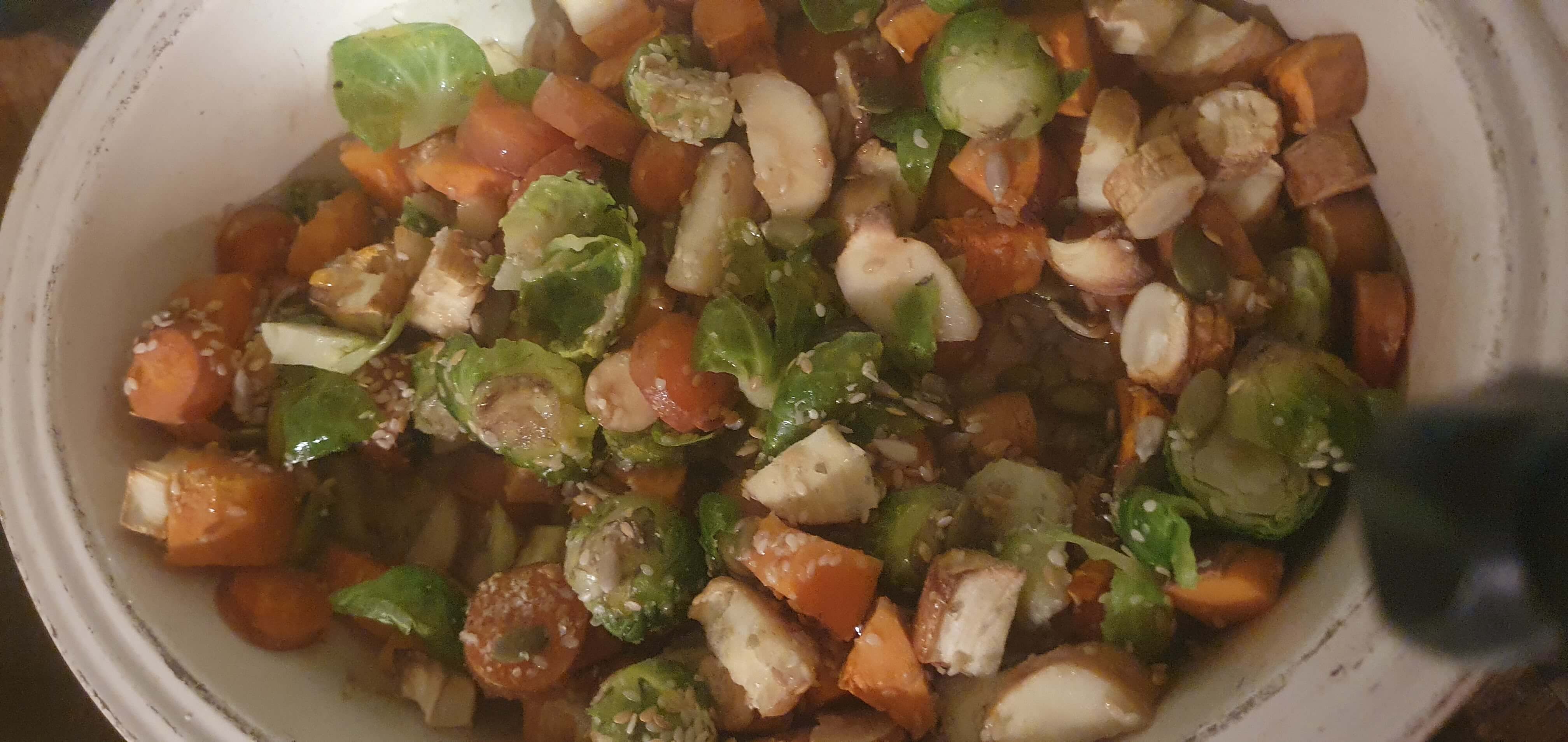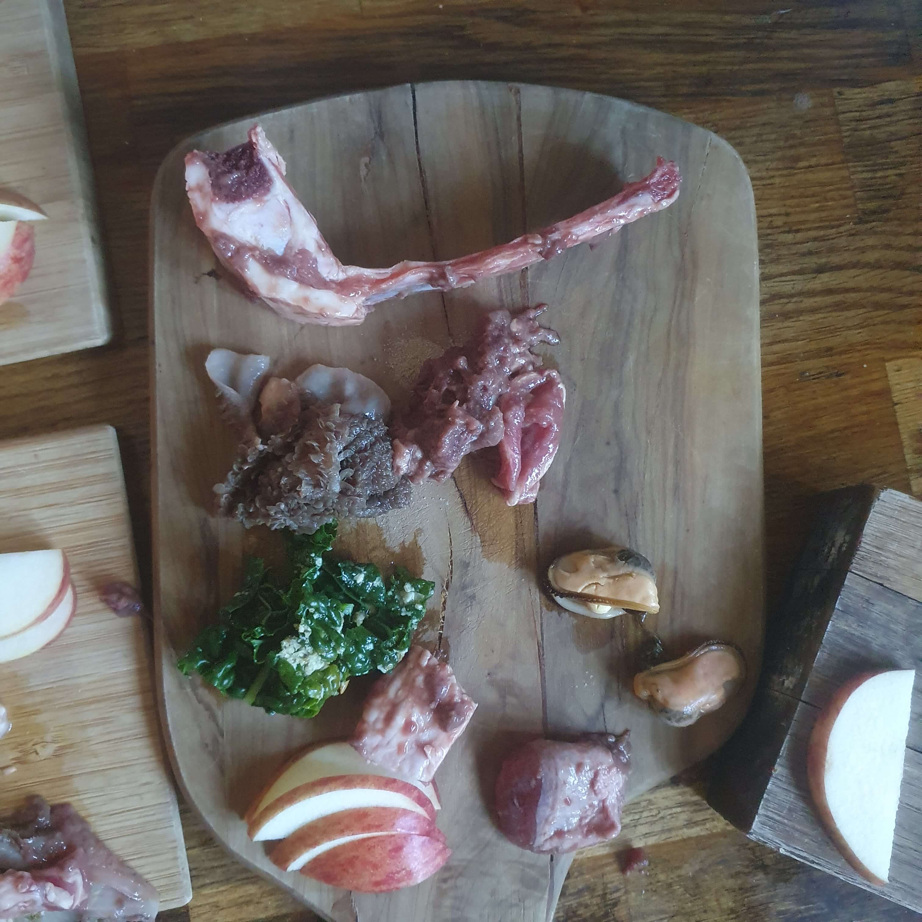 Raw lean muscle meat and organs should make up one third of your dog’s daily food. Raw meaty bones should make up another third of your dogs daily food choose things like pork, duck necks, venison ribs, venison neck, chicken wings (without the skin). Vegetables and fruit should make up the final 1/3 of your dog's daily food. It is vital that the ingredients are fresh and choose a variety and mix it up. I lightly cook my veg - generally roast with water not oil and lightly steam veg then add it all together and then drizzle over with olive oil and scatter some ground seeds (flax, chia, pumpkin and sunflower).