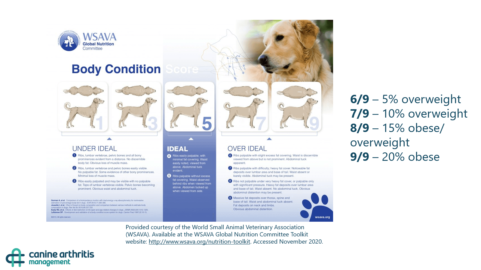 Unfortunately most owners underestimate how overweight their dog is and have a bit of a skewed approach so using a body conditioning scoretool is quite useful and also asking your friends for a second opinion a nice little tip I like is to clench your fist and feel over your knuckles and that is how your dog's ribs should feel otherwise do check out the Body Conditioning score chart below.