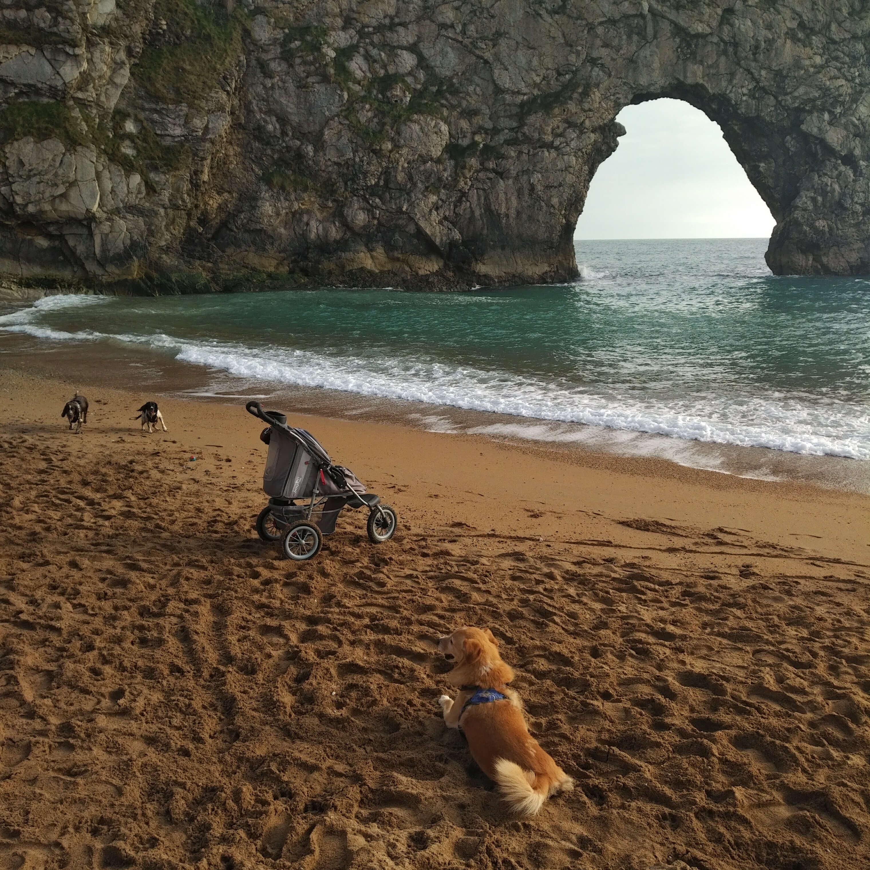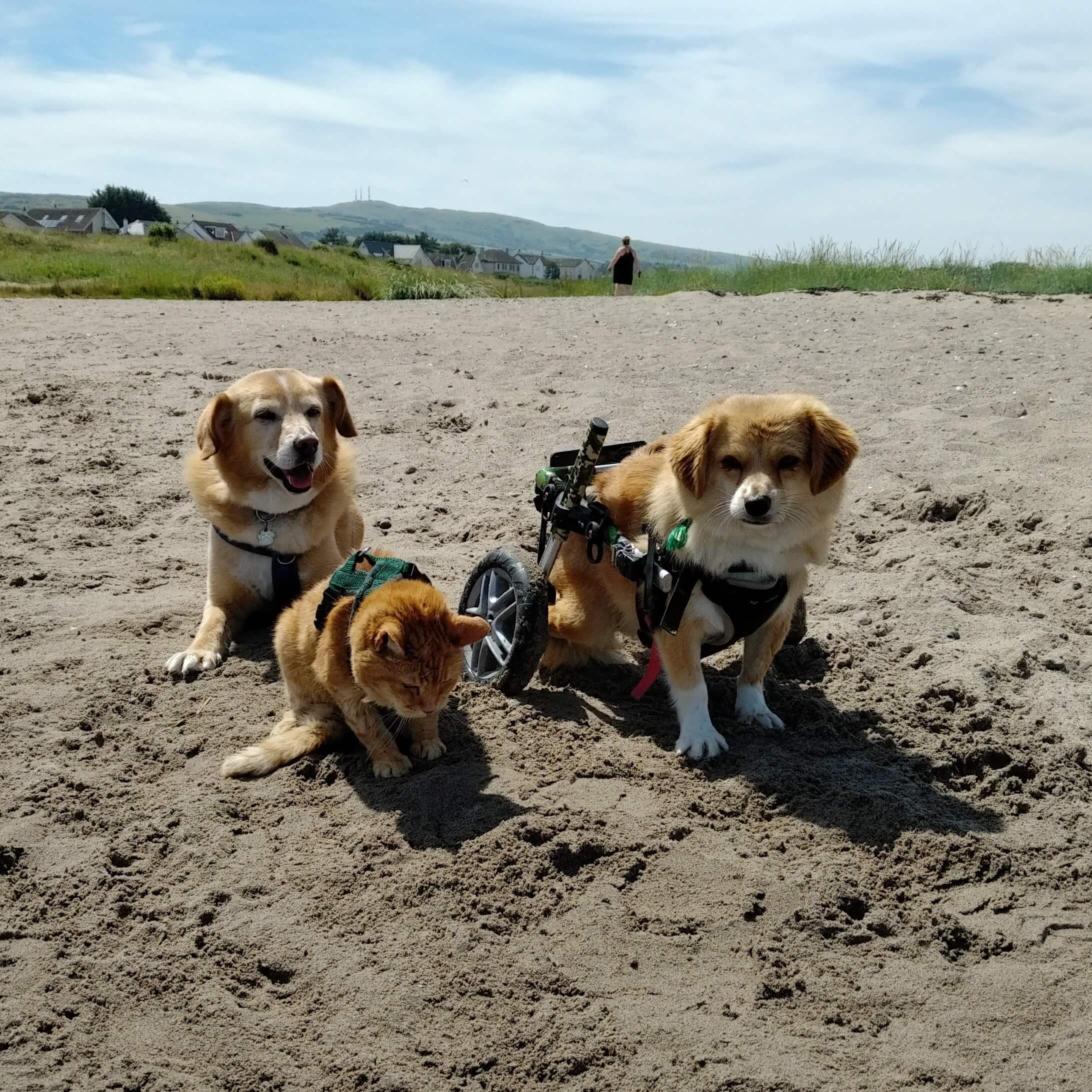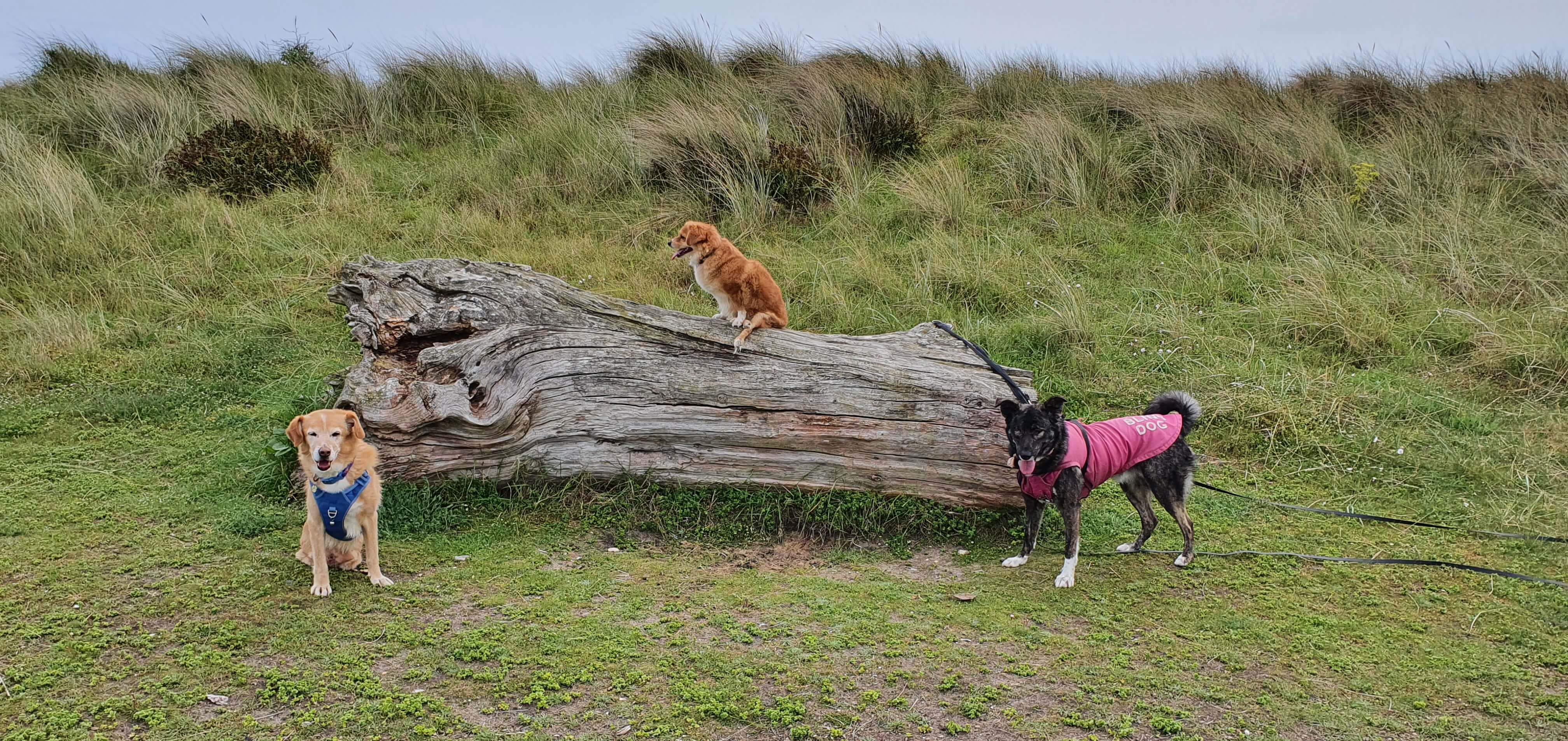 Bambi's first trip away to Scotland with Paddington & Maz on a beach in Ayr