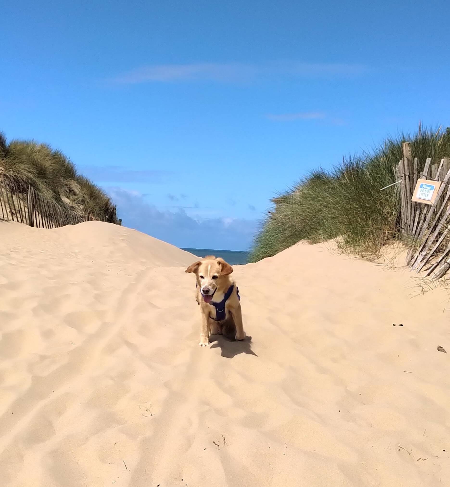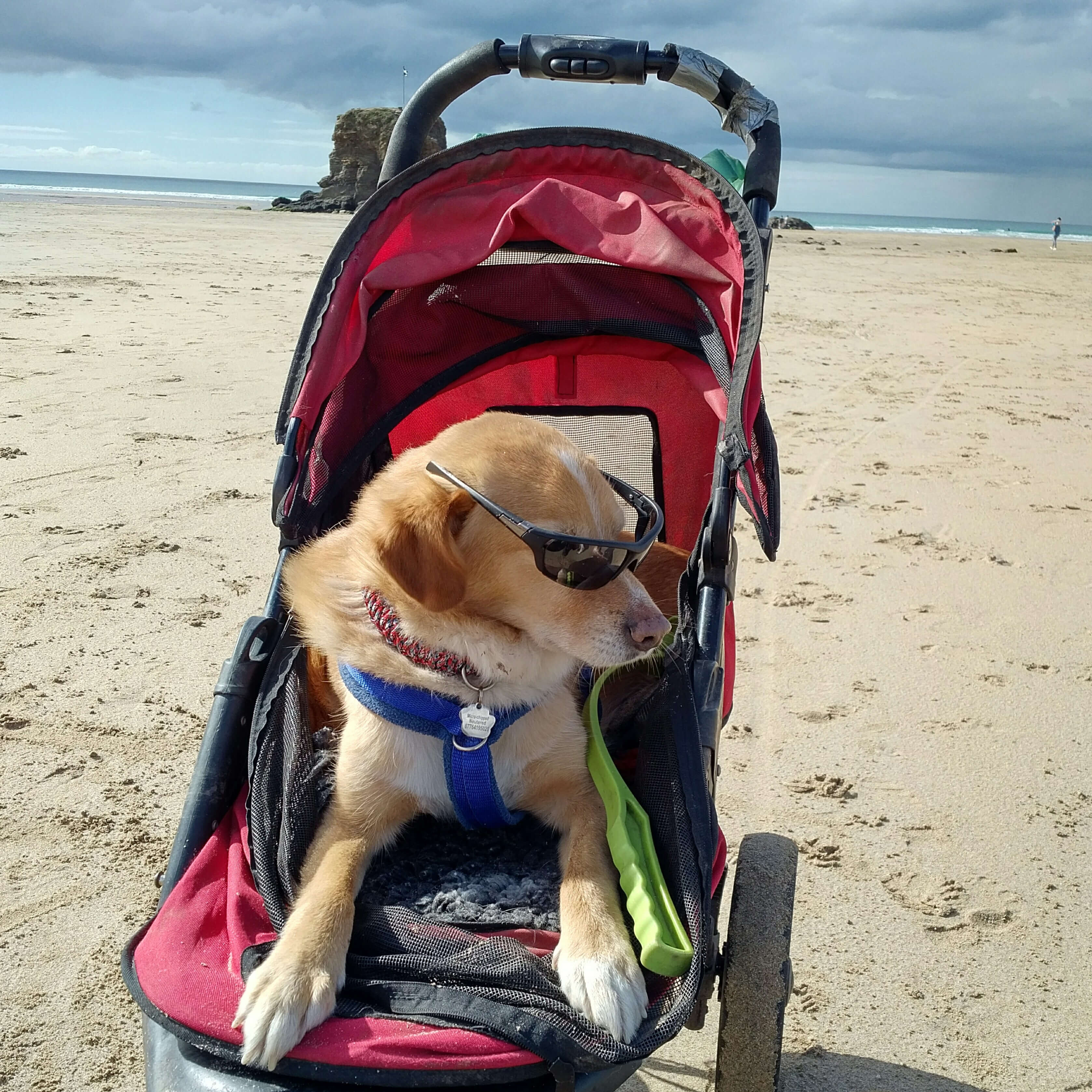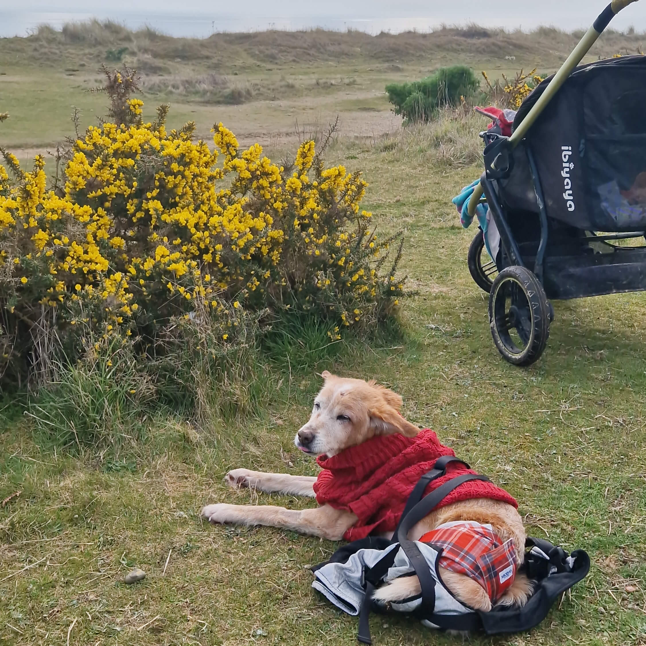 2 weeks post op enjoying the sunshine at Sizewell, Suffolk - our favourite place. Due to his op he couldn't go on his wheels yet so we were using a sling to try and maintain some muscle.