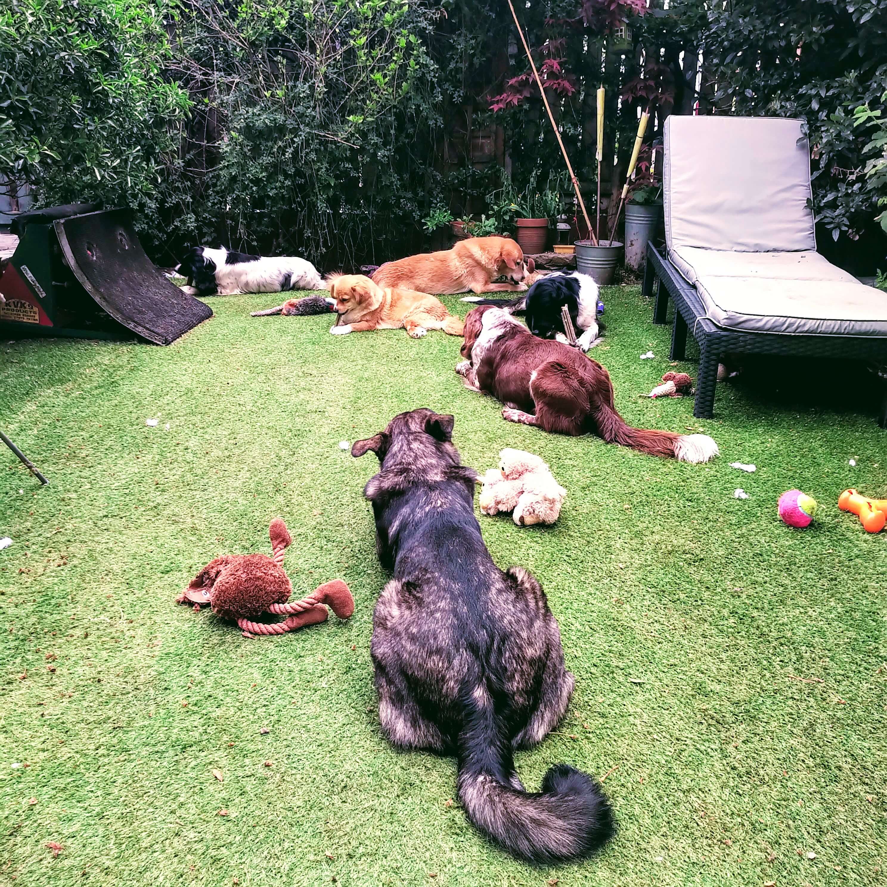 A summer's day and all the dogs and toys enjoying bones in the garden - from back to front - Evie, Maz, Bambi, Rowan, Seren & Inka