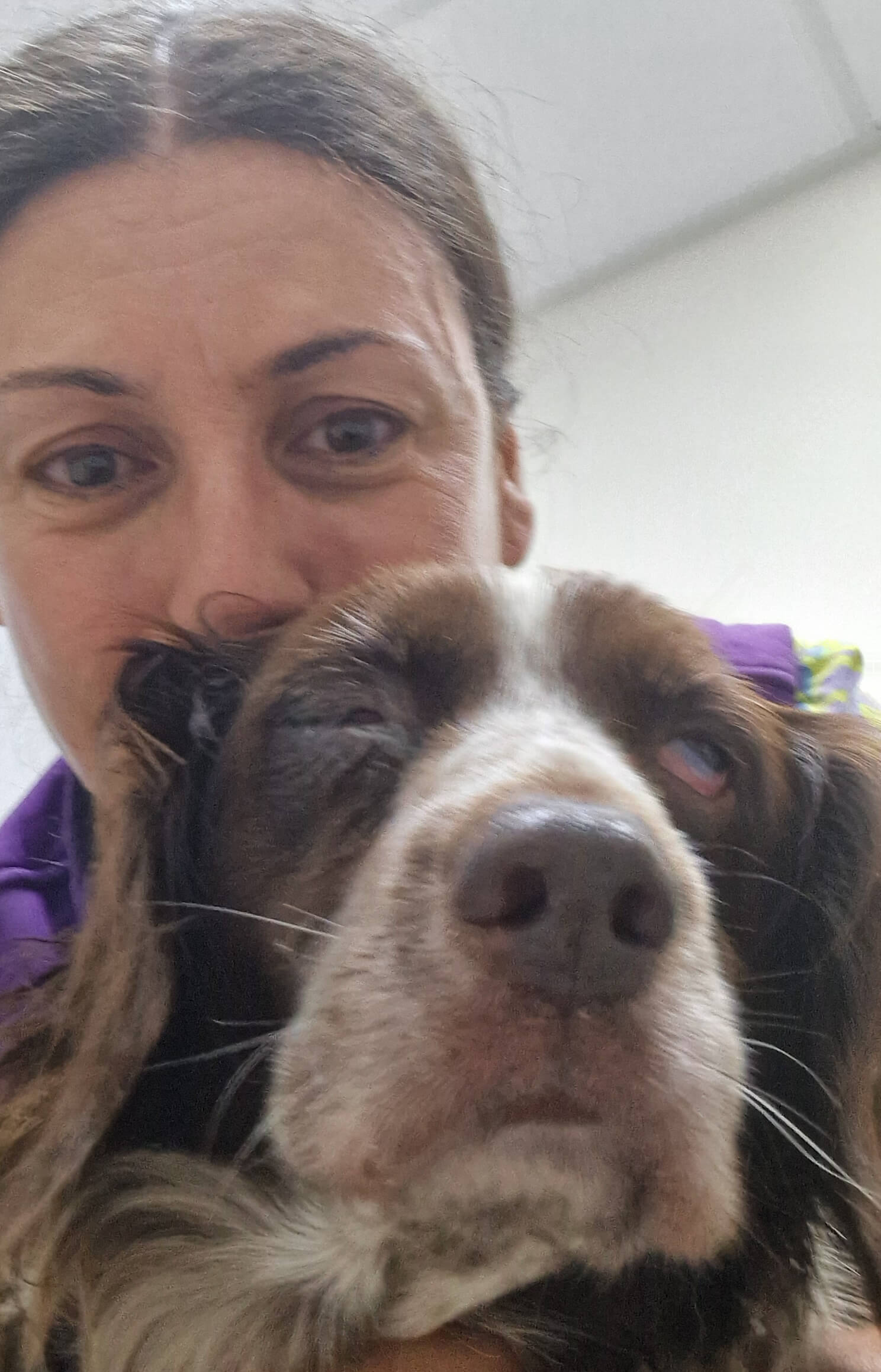 The diagnosis was upsetting. Lens luxation the right eye it was pushing into the anterior chamber hence the cloudiness and in the left it was in the posterior chamber. Both pressures in the eye were high with the right twice as normal and Seren needed an immediate procedure to reduce the pressure and hopefully save her sight. This was very hard for me as my beautiful dog Evelyn died under anaesthetic in May for a routine procedure for arthritis treatment . So our pre-procedure selfie was very emotional.